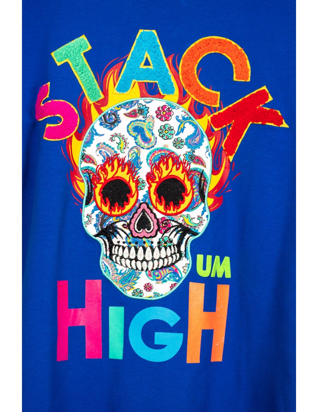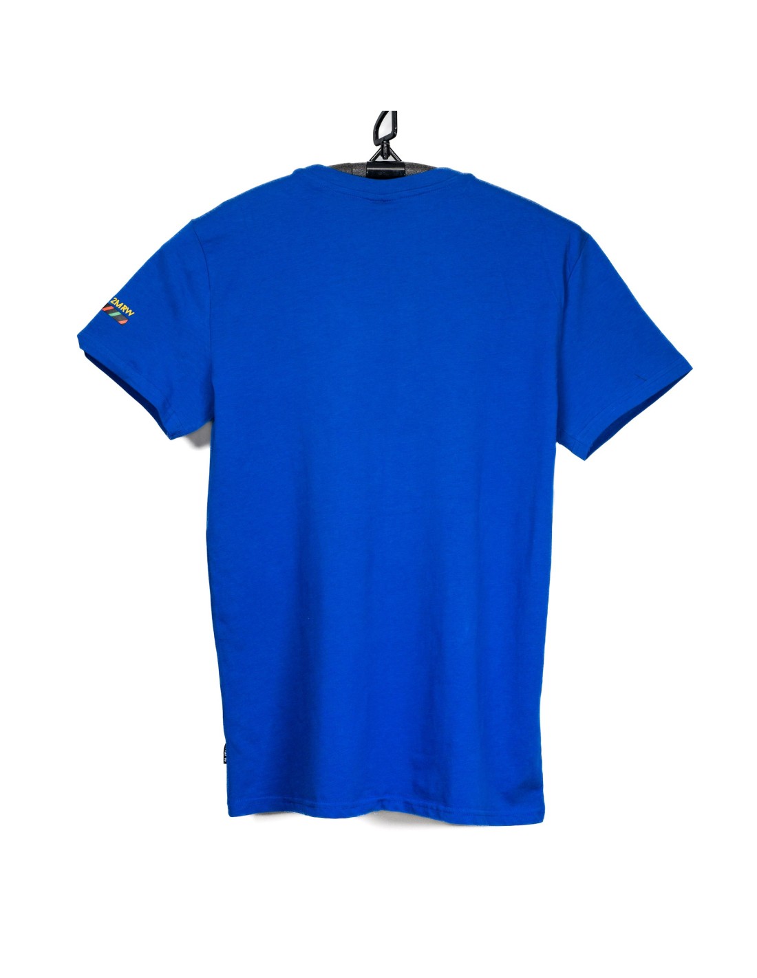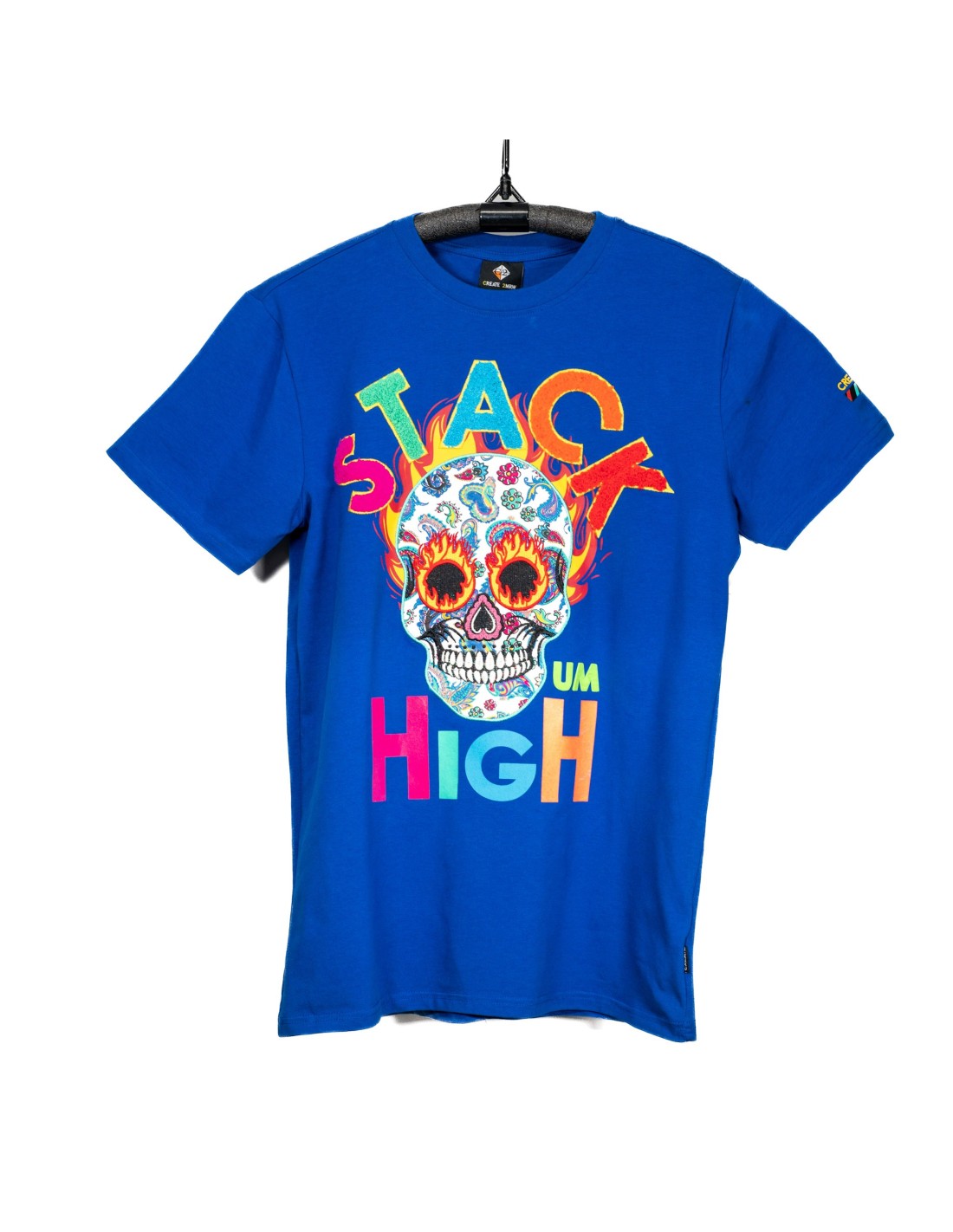 Camiseta CREATE 2MRW en azul eléctrico con diseño de calavera y colores neón. Lleva tu estilo al siguiente nivel.