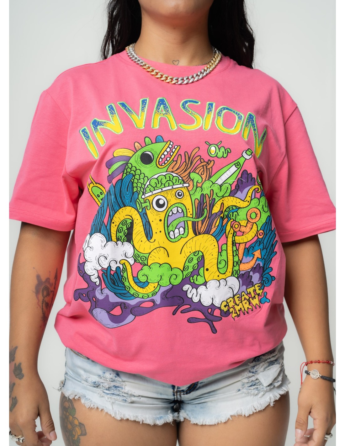 Camiseta CREATE 2MRW en rosa vibrante con gráficos de invasión cósmica. Dale a tu estilo un giro fuera de este mundo.